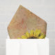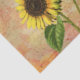 Vintage sunflowers over ephemera background of music notes and script with french advertisement.