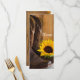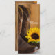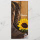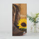Customise the charming Country Sunflower Western Quinceañera Party Menu with the details of the meal that you will serve at your rural farm or ranch style barn party sweet fifteen celebration event by adding the salad or first course, entree or second course and dessert or third course. This charming custom rustic sweet 15 menu features a quaint floral photograph of a yellow sunflower blossom, brown leather cowboy boots and barn wood. Perfect inspo for your cowgirl or vaquera.
