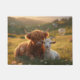 Capture the magic of the countryside with this whimsical image of a cute Highland calf and an adorable baby goat, relaxing in a field under golden light with floating bubbles.