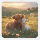 Capture the magic of the countryside with this whimsical image of a cute Highland calf and an adorable baby goat, relaxing in a field under golden light with floating bubbles.
