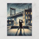This captures the romantic scene of a couple dancing under night sky and brooklyn bridge in the background