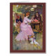 A couple are seated outdoors before a wicker table beneath paper lanterns. The lady, who is wearing a pink dress and has her hair up, is pouring tea for the gentleman who has stashed his straw hat and walking stick beneath the table. There's a little folding stool with the woman's book and umbrella proped against it. A vintage illustration from a 1908 magazine.