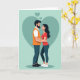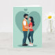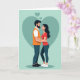This Valentine’s Day card shows a tender moment between a couple standing inside a large teal heart on a soft green background. Two small hearts float above them, adding a gentle symbol of affection. The man, with a dark beard, wears an orange top over a white shirt and blue pants, looking at his partner with warmth and care. The woman, with long dark hair, wears a red top and blue leggings as she embraces him softly. Their close eye contact and relaxed posture show trust, comfort, and deep connection. The blend of cool greens and teals with warm reds and oranges creates a calm and loving mood. This card beautifully expresses closeness and romance, making it a meaningful way to share Valentine’s Day love.