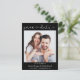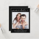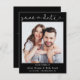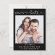 Couple photo Save the Date wedding announcement card with website information, white font on black.