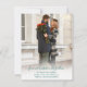 Couple photo Save the Date wedding announcement card with website information, emerald green font.