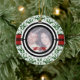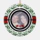 Couple’s first Christmas green damask pattern custom photo ornament. There is a black and white circle for your photo and a black and red stripe.