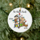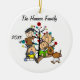 A pretty round ceramic keepsake Christmas holiday ornament features a stick figure family including a dad, mum, girl, and toddler boy as well as the family dog in front of a decorated Christmas tree with areas you can customise with your family name and the current year! This cute holiday keepsake ornament makes a great gift for the young family to commemorate a special year!