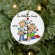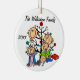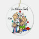 A pretty round ceramic keepsake Christmas holiday ornament features a stick figure family including a dad, mum, girl, toddler girl, and baby boy in front of a decorated Christmas tree with areas you can customise with your family name and the current year! This cute holiday keepsake ornament makes a great gift for the young family to commemorate a special year!