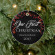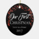 Our first Christmas with couples name and date script ornament keepsake with white on black typography and holly berries. Just add names and date on the front and a happy new year printed on the reverse. Just pick your style.