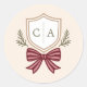 Elevate your holiday mailings with these stylish monogrammed envelope seals. Featuring a preppy, hand-drawn crest with evergreen sprigs and a rustic striped bow, this design adds a festive and personal finishing touch to your Christmas cards. Easily customise the seal with your couple's monogram using initials for each of your first names. © Kimbellished, LLC