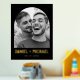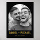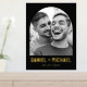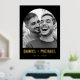 Poster featuring your custom photo inside a black or custom colour arch frame with the names and date in a gold or silver foil modern sans serif below.