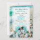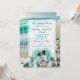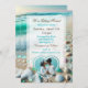 Wedding invitations with pretty blue and teal sea glass on a sandy beach with ocean waves. Upload your photo in the personalise area.