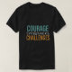 This t-shirt design celebrates bravery with the text "Courage Embraces Challenges" displayed in a vibrant multicolor scheme. The word "Courage" could be written in a bold and confident font, while "Embraces" uses a more welcoming and open style. "Challenges" might be displayed in a slightly bolder font, but with a dynamic flow to represent the ever-changing nature of obstacles. The colour palette could transition from warm and inviting hues for "Courage" and "Embraces" to cooler and more determined tones for "Challenges," visually representing the act of confronting difficulties with bravery. This design is a powerful reminder to face challenges head-on with a courageous heart.