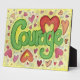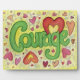 The inspirational word "Courage" is a bright green against a pale yellow. The word is surrounded by floating peach, pink, and red hearts. The "Courage" artwork was rendered in multimedia of pastel and watercolor on paper. Inspirational artwork by Laurel Latto for DonnaBellas Angels.