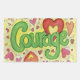 The inspirational word "Courage" is a bright green against a pale yellow. The word is surrounded by floating peach, pink, and red hearts. The "Courage" artwork was rendered in multimedia of pastel and watercolor on paper. Inspirational artwork by Laurel Latto for DonnaBellas Angels.
