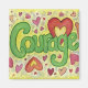 The inspirational word "Courage" is a bright green against a pale yellow. The word is surrounded by floating peach, pink, and red hearts. The "Courage" artwork was rendered in multimedia of pastel and watercolor on paper. Inspirational artwork by Laurel Latto for DonnaBellas Angels.