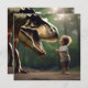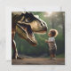 Pictured Is A Small Child Confronting A T-rex Dinosaur