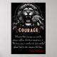 Unleashed Courage is depicted in this high-contrast black and white image. A fierce lion roars, a display of raw power, while a small tiger cub playfully climbs on its back. The dark background emphasises the subjects. "Courage" is written in bold, elegant red font in a stylised text box below. Nelson Mandela's quote reinforces the theme: "I learned that courage was not the absence of fear, but the triumph over it. The brave man is not he who does not feel afraid, but he who conquers that fear."