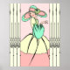 Courtney is a beautifully detailed remake of an old greeting card. She has been lovingly redrawn with new details and improved lines. She wears a full-skirted, multi-coloured dress with puffy sleeves and a matching hat with wide brim. The hat features a stylised flower with a fabulous bit of Art Deco lace in the centre. This composition is highlighted on either side by my reinterpretation of two beautiful pieces of French Art Deco ironwork. Available in sixteen stunning colour combinations.
