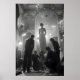 This stunning black and white photograph captures the dramatic intensity and quiet reverence of a haute couture fitting. A model, elevated on a pedestal like a living sculpture, is bathed in a celestial glow, her elegant gown a beacon of light against the shadows. Around her, a team of dedicated designers works with focused precision, their silhouettes a testament to the collaborative art of creation. The opulent salon, with its magnificent crystal chandeliers and grand mirrors, provides a breathtaking backdrop. The masterful use of high-contrast lighting creates a powerful, cinematic quality, turning a behind-the-scenes moment into a work of timeless art. Perfect for connoisseurs of classic photography, fashion history, and dramatic, narrative-driven imagery.