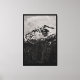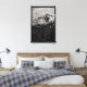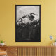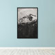 A black and white landscape photograph of a cloud filled sky trying to wrap itself around a snowy mountain. Trees cover the surrounding landscape of the taller mountain top. Image Copyright ©2023 Kimberly J Tilley. zazzle.com/store/developingnature