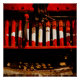 Cow catcher, or fender, or safety grid of a vintage steam train. Textured photography. Red and brown colours.