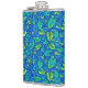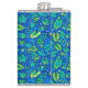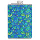 Flask featuring colourful floral pattern - yellow pond lily flowers, broad green leaves and blue dragonflies.