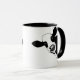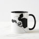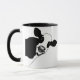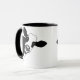 A black and white Ringer mug showing the head of a cow on both sides of mug.