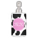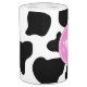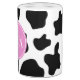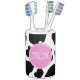 Black and white Cow print Toothbrush Holder and Soap Dispenser Set Funny animal pattern design with personalised initial letters. Customisable background colour. Cute bathroom gift idea for cow lover.