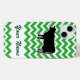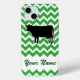 This stylish green and white phone case features the black silhouette of a moo cow! The background features a repeating green and white zig-zag chevron pattern with space to add your own name or short message in a green script font! Open the full editor to select a different chevron color!