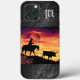 Personalise this Unique "One of a Kind" Cowboy and Longhorn Steer iPhone Case! It Features a Cowboy Riding a Horse Herding a Longhorn Steer During a Beautiful Orange Sunset...Surrounded by Black Leather Borders!