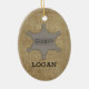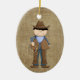 Cute little cowboy with dark hair, dressed in blue with a leather vest, chaps and boots. He's holding a lariat rope. The reverse side has a Sheriffs Badge and a place for you to personalise it with your sons' name. Fun Christmas ornament for your little cowpoke!