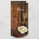 Customise the charming Cowboy Boots, Daisies and Horse Bit Country Wedding Menu with the details of the meal that you will serve at your rustic ranch theme engagement party, bridal shower luncheon or marriage reception dinner by adding the salad or first course, entree or second course and dessert or third course. This informal yet elegant custom equestrian theme nuptial menu features a quaint floral photograph of a pair of leather cowboy boots, bouquet of white and yellow daisy flower blossoms, white pearl necklace, horse bit and leather reins with a brown weathered barn wood background.