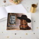 Cowboy funeral and memorial guest book with cowboy boots, cowboy hat and rope on a rustic wood background with rustic rope picture frame. This rustic cowboy western theme funeral guest book is easily customised by simply adding the photo and text of your choice.