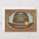 An adorable baby shower invitation that has a cute hat with a western sheriff star on top. The corners have a horseshoe and the horseshoes have cute blue dots. The invitation has a great western texture that gives the effect of wood.