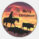 Personalise this Unique "One Of A Kind" Western Christmas Sticker! Featuring a Silhouette of a Cowboy Riding a Horse Herding a Longhorn Steer During a Beautiful Orange Moonlit Night!