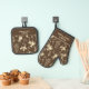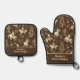 This personalised Western themed "chuck wagon" oven mitt and potholder set features a wild west pattern with a variety of rodeo cowboys in action riding, roping, and bronc busting, interspersed with saddles, boots, and hats, on a vintage background.