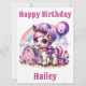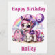 An adorable cowgirl pony is celebrating her 8th birthday with a purple balloon with the number 8 and a purple cowgirl hat on a farm. Personalise the card with your child's name.