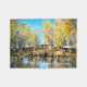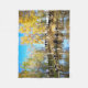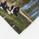 This small fleece blanket has bright contrasting colours in an autumn image of black and white Holstein cows at the watering hole below and amongst a stand of trees in yellow, gold, green, and orange leaves.