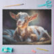 A tiny goat settles into a nest of blankets and straw, ears tipped forward and eyes catching the glow of warm barn light. Painterly fur, rich caramel and cream tones, and a softly shadowed background give this portrait a cozy, storybook feeling that fits beautifully with farmhouse, cottage, and rustic-inspired décor.