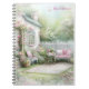 This notebook cover features a serene garden retreat beside a charming white cottage with arched windows and a green shingled roof. A tiled patio hosts elegant wrought iron furniture with soft pink cushions, inviting quiet moments with a teacup and book. Surrounding the scene, lush blooms in shades of pink, white, and green spill over flower boxes and beds, framed by a classic white picket fence. A bird in flight adds a gentle sense of motion to the tranquil setting, making this cover perfect for capturing thoughts, dreams, or reflections in a peaceful, nature-inspired space. Personalize with your own name.