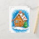 A cozy watercolor Christmas postcard featuring a charming gingerbread house surrounded by snow, candy details, and a festive winter glow.