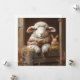 This heartwarming illustration depicts a fluffy white sheep wearing a colorful knitted scarf, nestled in hay within a rustic wooden crate inside a barn. A cute brown rabbit peeks out from behind the sheep. Colorful wildflowers and autumn leaves adorn the foreground, creating a charming and cozy scene.
