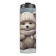 The bear is dressed in warm winter knits, specifically a chunky, light pink/beige knitted beanie and a matching cozy scarf. The background is a soft, blurred winter landscape, framed by snowy pine branches and falling snow. In the foreground, there are decorative Christmas ornaments in soft pastel shades (pink, blue, silver) and a wrapped gift box with a pink ribbon, emphasizing the festive, gifting spirit. The overall mood is sweet, serene, and perfectly cozy for holiday merchandise like tumblers and mugs