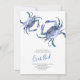 This elegant beach theme party invitation features the words Crab Boil set in a stylish handwritten script typography with event details in a classic charcoal grey serif font on a crisp white background. A replica of my original watercolor crab painting in shades of blue adorns the front. The invite card reverses to a complimentary navy blue colour. A coastal chic yet elegant choice for casual seaside New England beach, nautical or summer, 4th of July and engagement parties. To see my entire wedding stationery suite visit DoTellABelle on Zazzle.