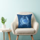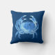 Throw pillow in a vintage sea life illustration of a crab, digitally enhanced and coloured in shades of blue and white, against a deep indigo blue background