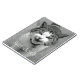 Black-and-white photograph of a yowling tabby-and-white domestic cat with customisable text.