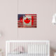 Print featuring the American flag fused with the Canadian flag on rustic wood with paint peeling off.