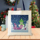 Vector illustration of two adorable cartoon snowmen dressed in knitted hats and scarves. The big crafty snowman is knitting an oversized scarf for the little one. The scarf is already wrapped several times around the cute little snowman.