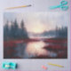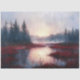 A tranquil painting of a cranberry bog at dawn, with deep red marsh grasses and calm reflective water. Mist rises in the distance, partially veiling the dark evergreen trees, while the golden sun glows softly through the haze.